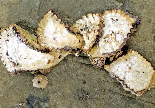 こちらも岩肌にぴったりとくっ付く、イワガキです。