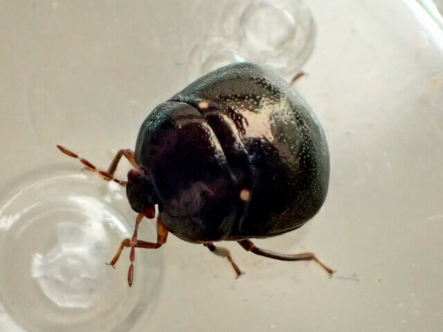 本家マルカメムシに形状は似ていますが、こちらは真っ黒色のタデマルカメムシ