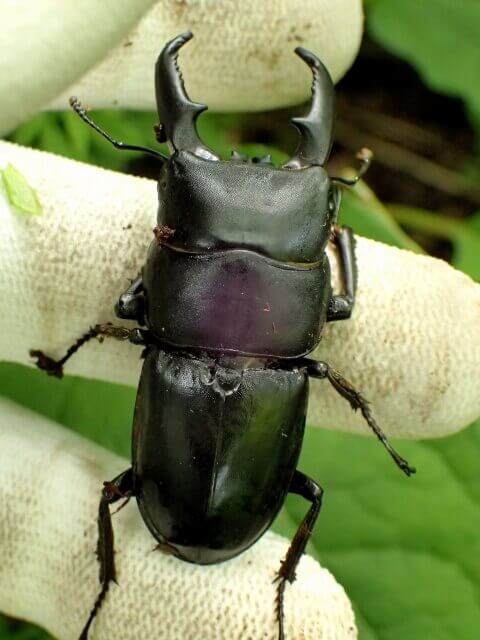 ハルニレの樹液で汚れていますが、クワガタ自体の背中はとてもキレイでツルツルですね。