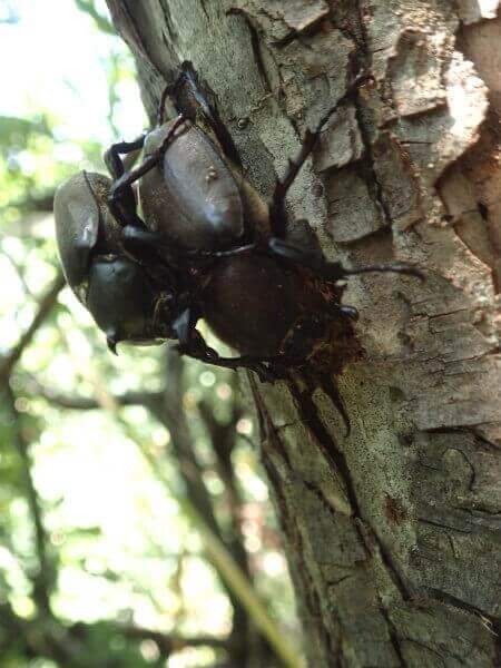 ヤナギに集まるカブトムシ♂と♀のカップル