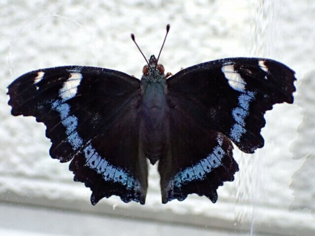 黒い下地に瑠璃色のブルーが何とも美しい蝶です。