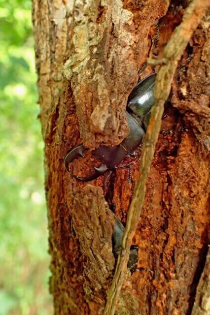 ポイントに到着してすぐに、ハルニレ木に頭を突っ込む食欲旺盛なコクワガタ♂の姿を発見!
