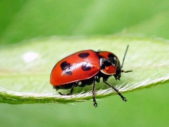 真っ赤に黒い斑点、ぱっと見ナナホシテントウと間違えそうです💦