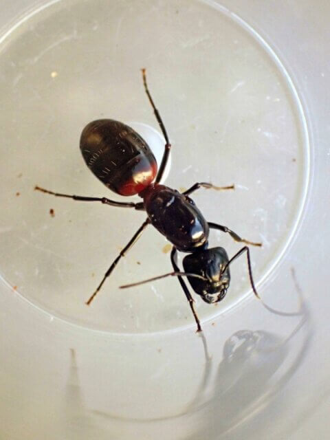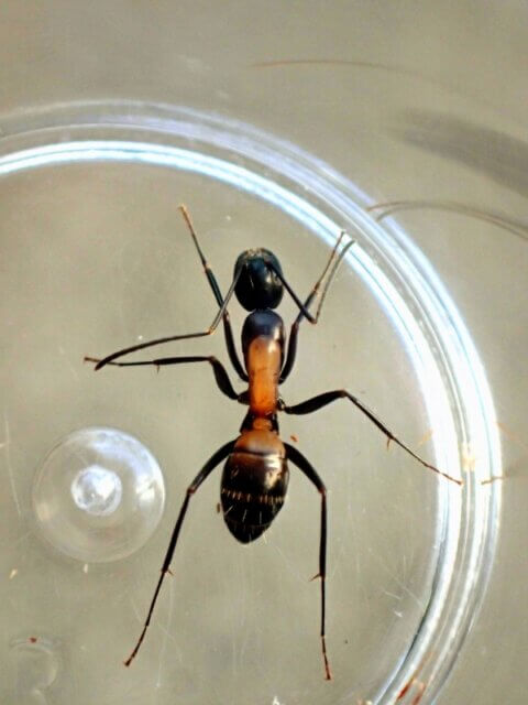 山中で倒木をどかして何かいるか探してみると、ニシムネアカオオアリがいました。
