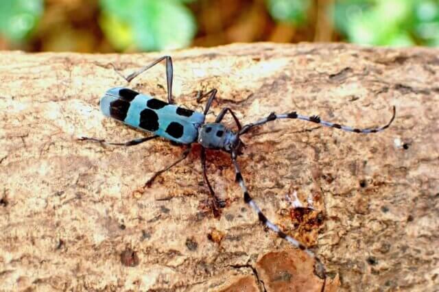 ブルー色と基本とし、黒い斑点が目立つとても美しいカミキリムシです。