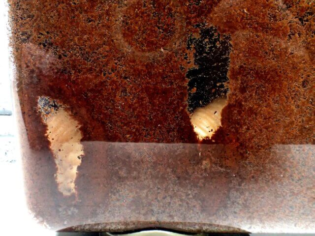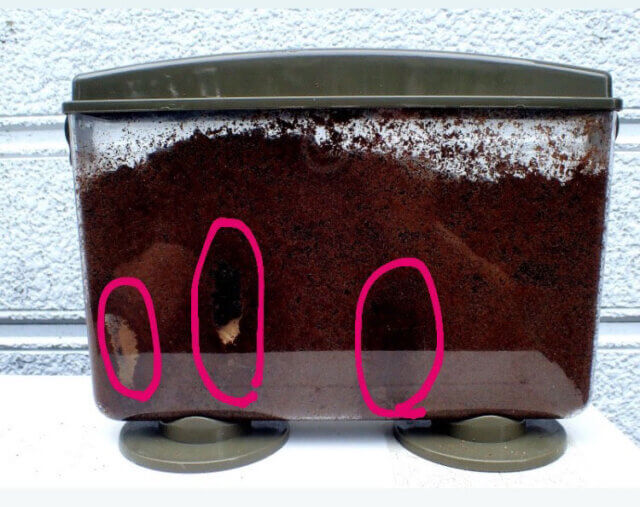 蛹室を作っている様子が伺えるのは縦長の赤マルで囲った部分です。。
