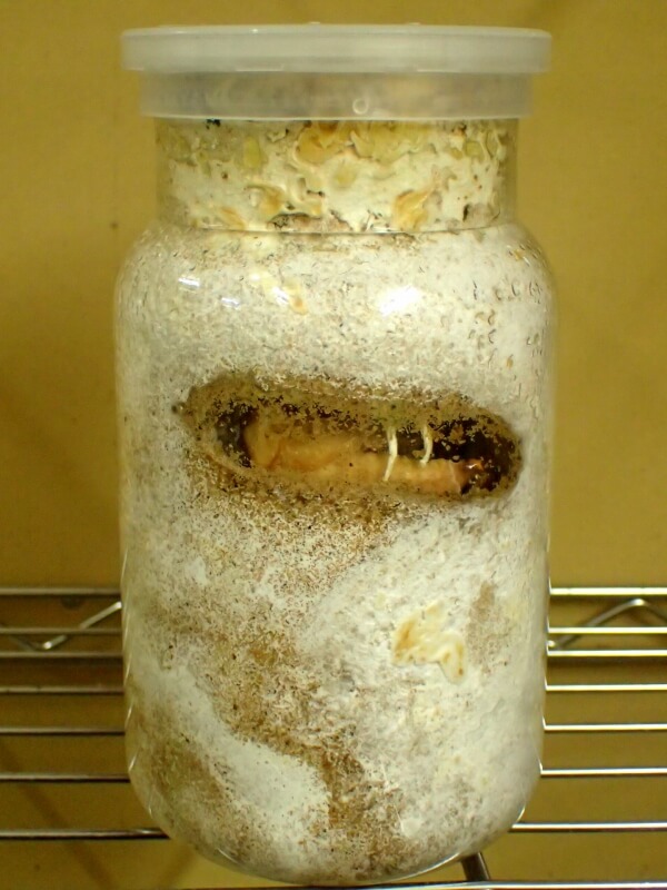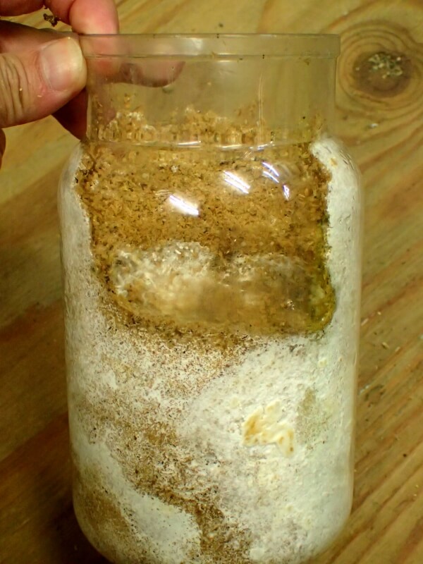菌糸ビンを上から掘り起こしていって、露天掘りにします。