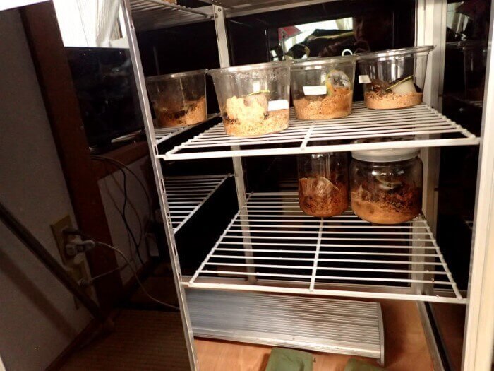 クリーンケースやプリンカップで管理している成虫・菌糸ビン、下段の方にも成虫を管理。