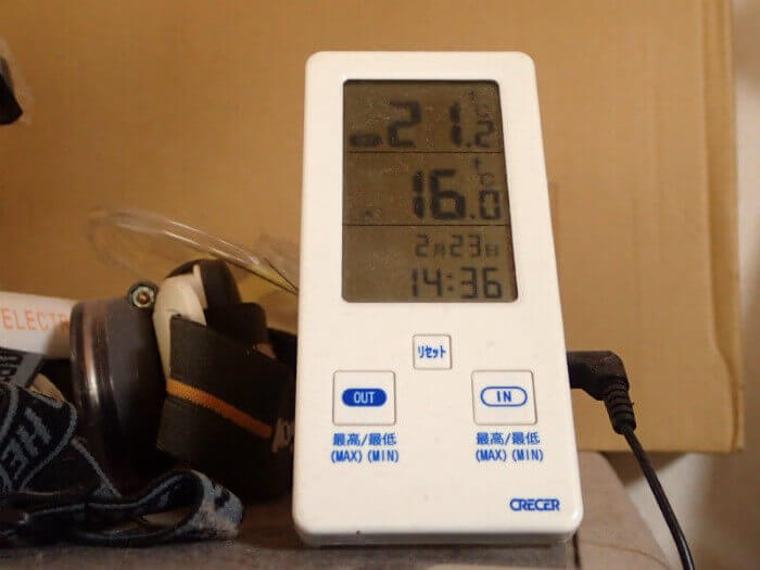 室内外を測定できる温度計にてきちんと温度管理。