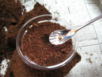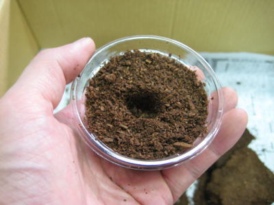 プリンカップに発酵マットを入れ、中央に卵や幼虫が入る程度の穴を開けます。ここで使用しているマットは、産卵床で使用したきのこMatです。乾燥気味だったので、少し加水しました。