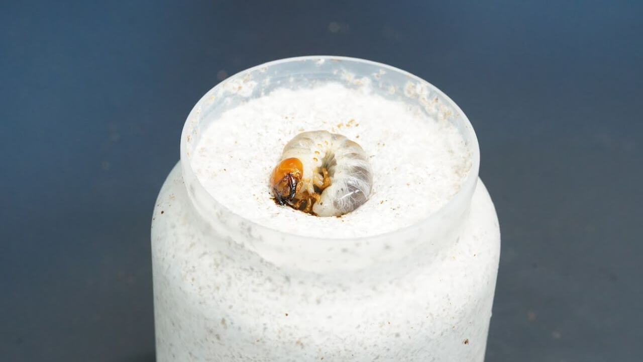 Q.菌糸ビンのほとんどが黒くなり交換しようとしたところ、少しシワのある黄色がかった幼虫が出てきました。この場合どうしますか?