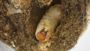 Q.菌糸ビンのほとんどが黒くなり交換しようとしたところ、少しシワのある黄色がかった幼虫が出てきました。この場合どうしますか?