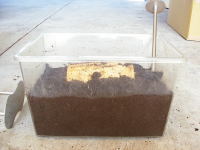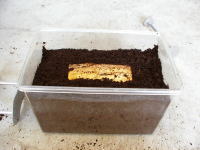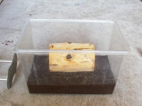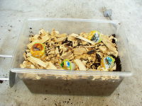そこに皮むき&加水した産卵木をおきます。転がしタイプのセットの場合には硬く詰めた上に軽く2cm程度、発酵マットを敷いてその上に産卵木を置き、ゼリーなどのエサと樹皮などをセットし完了です。