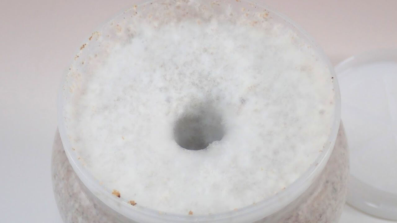 菌糸ビンを作製中、フタを開けた部分に見受けられる