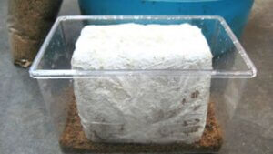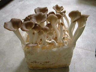 菌床の肩の部分より袋を切り取り菌床の下にトレーを敷き水を入れビニール袋で覆って約15~20℃の場所に置くと、この様にきのこが発生します。