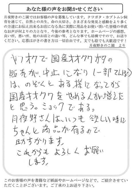 ヤフオクで、国産オオクワガタの販売が中止になり(一部てんぽ)は、のぞくとある様になってから国産オオクワをやめる人が増えたと思う。ショックである。月夜野さんは、いつも欲しい時にちゃんと商品が有るので助かります。これからもよろしくお願いします。