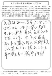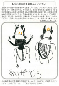 かぶと虫のペアを送って下さり、早速マットの中に入れました。来年のたまごが楽しみです。大切に育てて来年はたくさんのペアが育つ事を楽しみにしています。