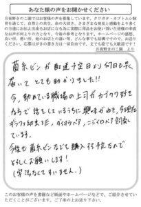 電話しましたら即送って下さり、びっくりしました。ご発展を祈ります。カブト虫は1年中カンサツできます。孫や子供のために。