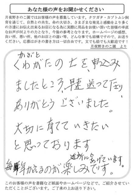 かぶと・くわがたの土を申込みましたところ、早速送って下さり、ありがとうございました。大切に育てていきたいと思っております。毎年かえるのが楽しみです。