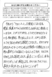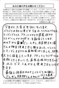 今回カブト虫の幼虫を1頭いただきましたが、孫が3人いて3人ともクワガタ・カブトが好きで、今回の幼虫を本来ならもう一頭欲しかった。入荷があれば、ぜひ連絡して欲しい。ここは、アフターケアが、完ぺきで非常に安心しております。今後ともよろしく。