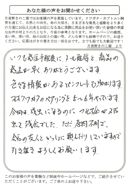 いつも発注手配後に、メール配信と商品の発送が早くありがとうございます。色々な情報があるパンフレットも助かります。オオクワガタのペアリングを5~6年やっています。今回は成虫になるのにフ化不全が2匹出て残念でした。ただ原因不明で、会社友人といっしょに頼んだりしていますので引き続き、よろしくお願いします。