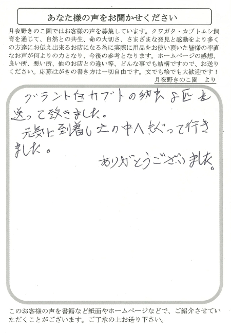 グラント白カブトの幼虫8匹を送って頂きました。元気に到着し、土の中へもぐって行きました。ありがとうございます。