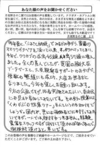 今回、初めて生体と菌糸ビンを購入させて頂きました。感想は一言で「素晴らしい」です。北海道在住なので冬場の気温が気になり正直不安でしたが、愛を感じる細い梱包は大満足でした。送料1,040円かかっても貴園から購入したいと思いました。ありがとうございました。