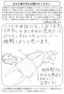 お世話になります。いつも良い商品ありがとうございます。菌糸ブロックもばっちりです。これだけの技術があればトリフの栽培も出来るのでは?トリフの栽培が出来る菌糸を開発してもらいたい!