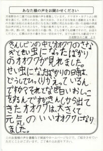 リーズナブルな値段で欠品もなくだんだん品数もふえて大変ありがたく思っています。国産オオクワガタを中心にヒラタ ニジイロ と飼育していますが国産大クワは76mm以上を何年も前から満足な成績を残しています。あとは産卵木を扱ってほしいですネ!