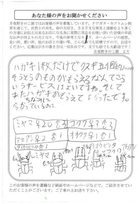 ハガキ1枚だけでクヌギ五個約2000円そうとうのものがもらえるなんてこういうサービスはよいですね。そしてまたハガキがもらえてよかったです。