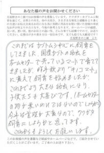 今回はダイオウとスマトラを購入しました。2ペアともとても元気です。特にダイオウは元気すぎてたまに飛びます。それにこの2ペアはWDとはいえ破格の値段です(笑)今度はキノコマットを購入して、産卵と大型個体羽化を目標として飼育していきたいと思います。本当にありがとうございました。