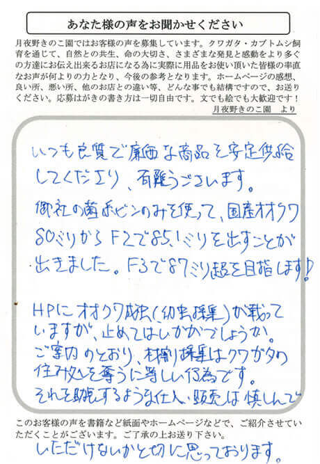 いつも良質で廉価な商品を安定供給してくださり、有難うございます。御社の菌糸んビンのみを使って、国産オオクワ80ミリからF2で85.1ミリを出すことが出きました。F3で87ミリ超を目指します!HPにオオクワ成虫(幼虫採集)が載っていますが、止めてはいかがでしょうか。ご案内のとおり、材割り採集はクワガタの住み処を奪うに等しい行為です。それを助長するような仕入・販売は慎しんでいただけないかと切に思っております。