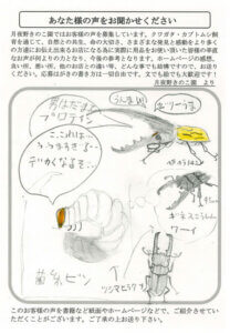 いつも良質で廉価な商品を安定供給してくださり、有難うございます。御社の菌糸んビンのみを使って、国産オオクワ80ミリからF2で85.1ミリを出すことが出きました。F3で87ミリ超を目指します!HPにオオクワ成虫(幼虫採集)が載っていますが、止めてはいかがでしょうか。ご案内のとおり、材割り採集はクワガタの住み処を奪うに等しい行為です。それを助長するような仕入・販売は慎しんでいただけないかと切に思っております。