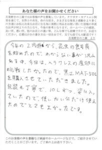 ていねいなおハガキ、ありがとうございます。私の夫がオオクワがほしいと申しまして、購入しました。元気に到着いたしました。去年購入したペアのメスが死んでしまい、メスだけほしかったのですが…ペアでもそちら様のは、立派で満足しています。夫は産卵にチャレンジしたいといっております。そちら様のホームページ等みさせていただきます。