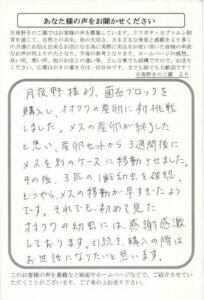 今回はじめて PREMIUM CLEAR BOTTLE EP1400 15本入ケースを購入しましたが、今までG-potを利用しておりまして、価格が高く、ボトル内の状況も見えず不安でしたが月夜野きのこ園より購入しました品は幼虫の動きも見えて良かったです!!