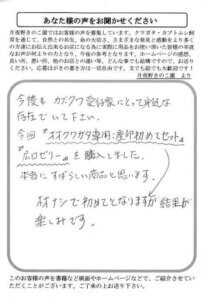 立派なオオクワをありがとうございます。大事に育てて増やしていきたいと思います。その後に買ったボトルやマットも安いのに質が良くて大満足です。おかげさまでクワガタに目覚めて毎週森に探しに行っています。最近は国産だけではなく外国産にも手を出し始めましたが、外国のものは力が強くてこわいです。今後も利用させていただきたいと思います。よろしくお願いします。