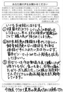 この度は、まさかプレゼントが当選するとは思っていなかったので驚きましたが、クワガタ‐カブトに必須なのでとてもありがたく、感謝しています!昨年から飼育している国産カブトに加え、新たにニジイロクワガタとムシモンオオクワの幼虫を迎え入れました。月夜野きのこ園さんのホームページを見て、飼育方法や温度管理の方法など、チェックさせてもらっています。Basic菌床ブロックを自分でビンに詰め、菌が白く回ったら幼虫を入れました。まだ間もないですが、元気に食べ進んでいるようです。カブトが羽化してきたら、月ゼリーを与えてみようと思います!昆虫ゼリー=カップ型のイメージだったので早く使ってみたいです!