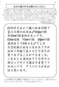 先日は早い対応で品物をお送りくださり、ありがとうございました。飼育しているのは主人(39)で、大変満足しています。2人の子供も(6歳男の子、3歳女の子)お父さんと一緒に鑑賞して楽しむので、来年無事ヒラタクワガタが成虫になることを願っています。主人はお送りいただいた新聞や広告を見て早くも「次はこんなの欲しいなあ。」と喜んでいます。カブトムシは昨年から飼育して無事成虫になったので、大切に大切に、これからも育てていきたいです。