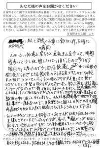 初めてハガキを出させていただきます。月夜野きのこ園さんの魅力は、早い・安い・高品質だと私は思っております。うちで飼育しているクワガタ達も食いつきが全然違います。よっぽど美味しいんだなぁといつも見ています。また、注文後すぐに対応していただけるのが本当に助かります。初心者の私は、計画を立てて購入するのが苦手なので、毎回助けていただいております。今後ともどうぞよろしくお願い致します。まだまだ寒い日が続くので皆様、お体ご自愛ください。