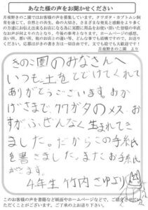 以前購入したオオクワガタの幼虫は元気に育っています。今年の夏カブトムシの産卵セットを組んで40個ほどの卵がとれ、完熟マットで元気にふ化させることができました。来年の夏が楽しみです。