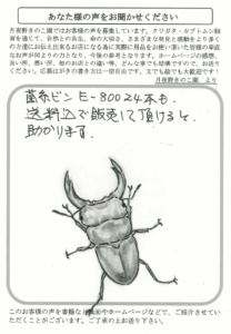 カブトムシ飼育を始めてから、最近になり貴社のマットのことを知りました。カビ等もなく、とてもサラッとしたいいマットでした。幼虫たちも喜んでいるようで、とても活発に動き回り、フンも大量です。マットがおいしいんですね。これからもお世話になります。ありがとうございます。