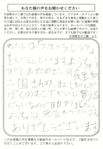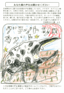 ぼくは、クワガタやカブトムシをそだてることが大好きです。少し前いとこのお父さんからクワガタの幼虫を六ぴきもらってうれしかったことがあります。その菌糸ビンが今ぼくがかった菌糸ビンです。きょ年の十一月に土をかえてみると体がものすごく大きくなっていました。そのときぼくは「大きくなったね」や「かわいい」と思いました。ぼくはなにより土のえいようをたべたりしたんだなと思いました。ぼくは何より土のおかげで大きくなったんだなと思いすごくかんどうしました。これからもいろいろな人に土をつくりつづけてください。おうえんしてします!!