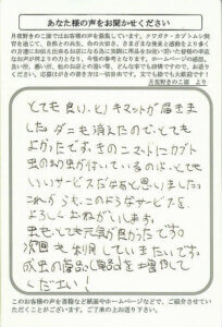 幼虫を購入しましたが、飼育は初めてなので、HPを見ながら飼育しています。大変に参考になります。購入時から、次の菌糸ビンの交換時期のおしらせメールなどや、その時のおすすめ商品などをメールなどで送ってもらえると、助かります。