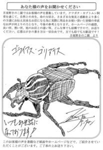 今回、菌糸ブロック(Basicではない方)を購入させて頂きました。800mlとプリンカップに詰め直したところ、すぐに再生し、1週間ほどですごくきれいな色になりました。インドグランディスとタイワンオオクワ、ネパールアンテ等に使っておりますが、成育はとても順調です。また、すぐにリピートさせて頂ければと思っています。どうぞ宜しくお願い致します。