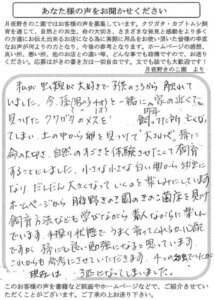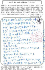 クワガタ飼育2年生(2年目)の素人です。EP-800 32個セットを購入させて頂きました。1年目はコクワのメス1匹から2匹の幼虫だったのですが、今シーズン(2年目)はノコギリ・コクワ・アシアカ(もしかしたらスジも)のメス8匹で産卵セットを組んだら、結果100匹以上の幼虫が捕れました。なので32個セットを購入しました。今回購入した菌糸ビンに投入する幼虫達にとって2本目の菌糸ビンです。1本目は別の所から500ccの菌糸ビンのセット売りを購入したのですが、キノコがはえたり、水がビン表面に浮き出ているものがあったりしてあまり良くないものが結構な数含まれていたので、次は別の所で購入しようとネットで菌糸ビンのセット売り検索で御社にヒットしました。購入した菌糸ビンは良さそうでしたので次も購入したいと思っています。