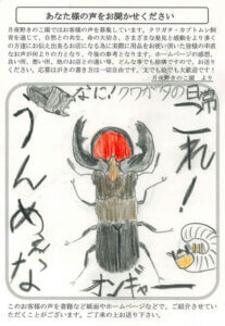 注文したクワガタの調子が悪かったようで、別にクワガタを提案して下さいました。元気いっぱいのクワガタが届きました。暑いので心配していましたが、安心しました。対応も早くよかったです。