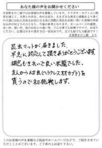 いつもお世話になっております。先日、当店で5,000円の福袋を初めて購入いたしました。成虫は、スマトラヒラタのペアとダイオウヒラタのペアとオオクワガタの幼虫3頭入っていました。幼虫を菌糸ビンで飼う事は、初めてでわからない事だらけでしたが、電話をしてみたら、男性の方が親切丁寧にいろいろと教えてくれました。3頭のうち1頭の食が細いのが少し心配ですが、ごっついオスのヒラタ君達がエサをたくさん食べてくれるのが、とてもうれしいです。今回は、オオクワ(国産の)ペアを購入しましたが、オオクワ君達は、とてもおだやかで、ペアでいるところがとてもほほえましいです。うちには、メダカやヤドカリやクワガタがたくさんいます。こんなペットにいやされる毎日です。これからも利用させて頂きますね。