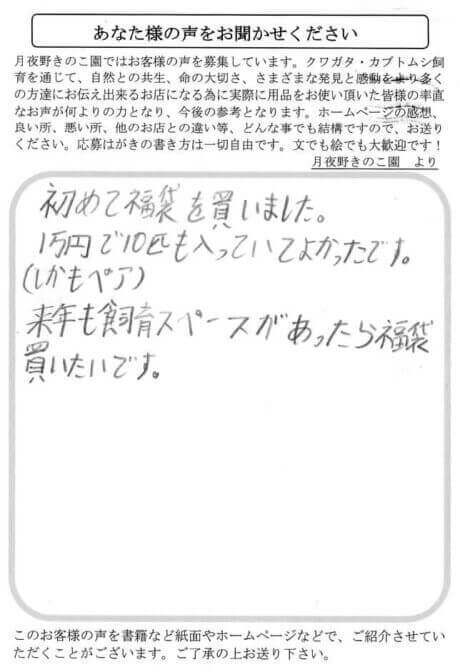 初めて福袋を買いました。1万円で10匹(しかもペア)も入っていてよかったです。来年も飼育スペースがあったら福袋買いたいです。