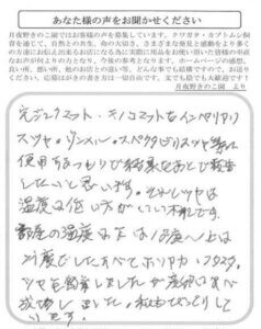 先日、きのこマットを注文しました。3日間ガス抜きをして使用しました。くわしい使用例などあるといいかと思います。ハガキ等で返信あればうれしいです。