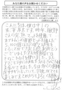 飼育用品購入の際の領収書の発行ですが、自身で印刷する方式ではなく、以前のように発行して頂く方が非常に有難いです。マット自体が使用しやすく、ヘラクレス等も大きく育っていますので、大満足です。よろしくお願いいたします。